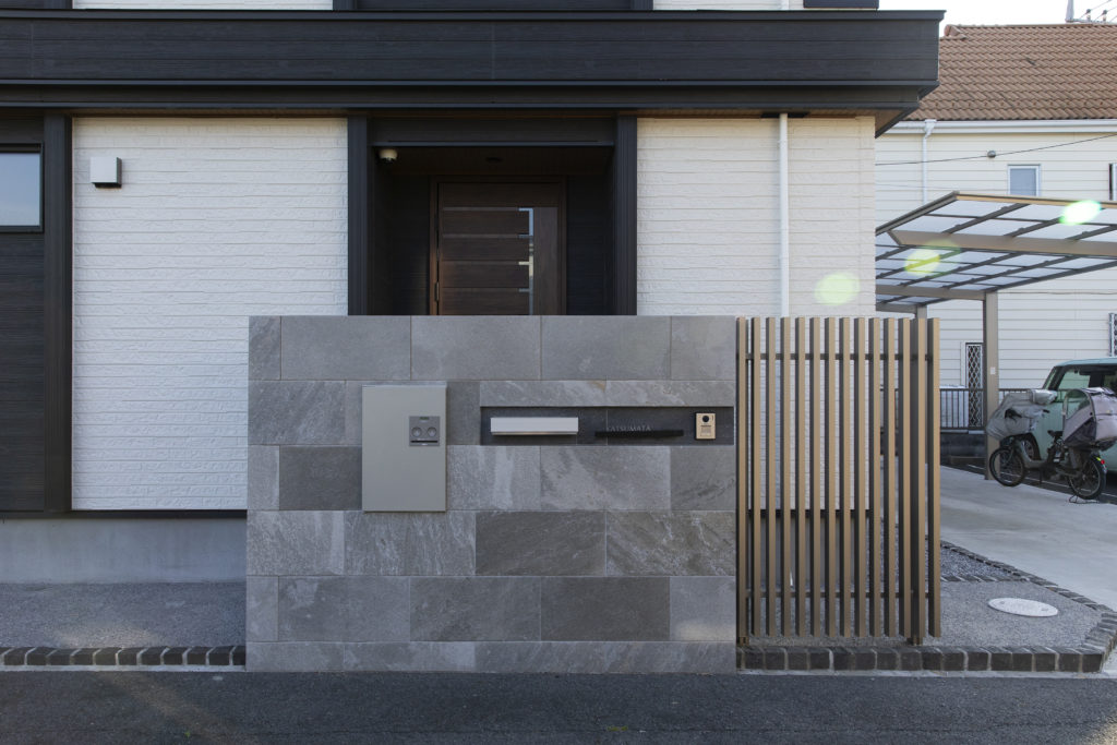 門袖は存在感のあるタイル貼り仕上げ。ポストやインターホンもすっきりと配置し、モダンな印象を与えています。アプローチ部分にはコンクリートと自然石を組み合わせ、質感のある空間に仕上げました。