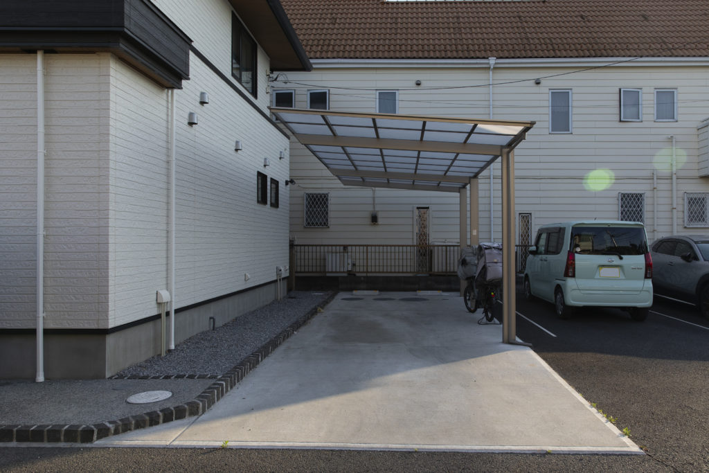 広々とした駐車スペースは、シンプルなコンクリート仕上げで機能性を重視。来客時にも十分なスペースを確保しています。