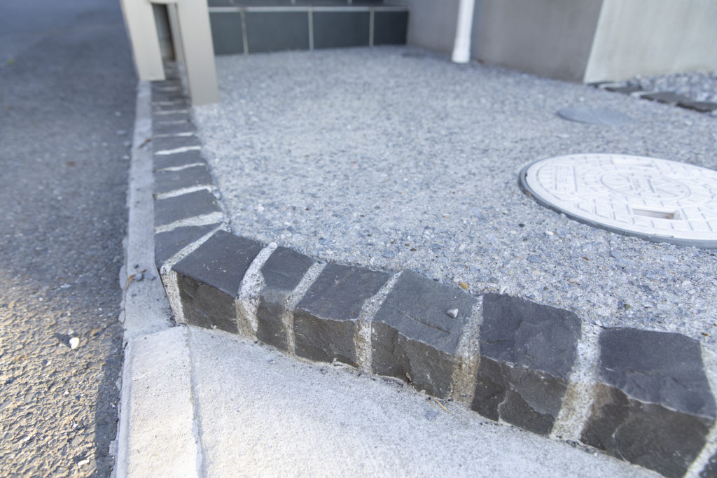 細部の仕上げにもこだわり、縁石やアプローチの素材感を活かした施工を行いました。シンプルながらも質感の違いを楽しめる外構です。